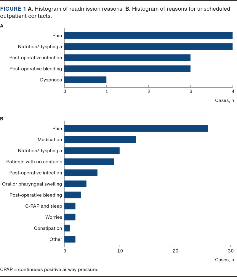 The median length of hospital stay was three and a half days, although some patients required extended admissions. Approximately one in five patients were readmitted, most often for pain, followed by post-operative bleeding and infection (Figure 1 A). Unscheduled outpatient follow-up was frequent, with phone consultations being more common than in-person visits. Among outpatient contacts, pain was again the leading cause, followed by medication-related concerns, dysphagia and signs of infection (Figure 1 B).