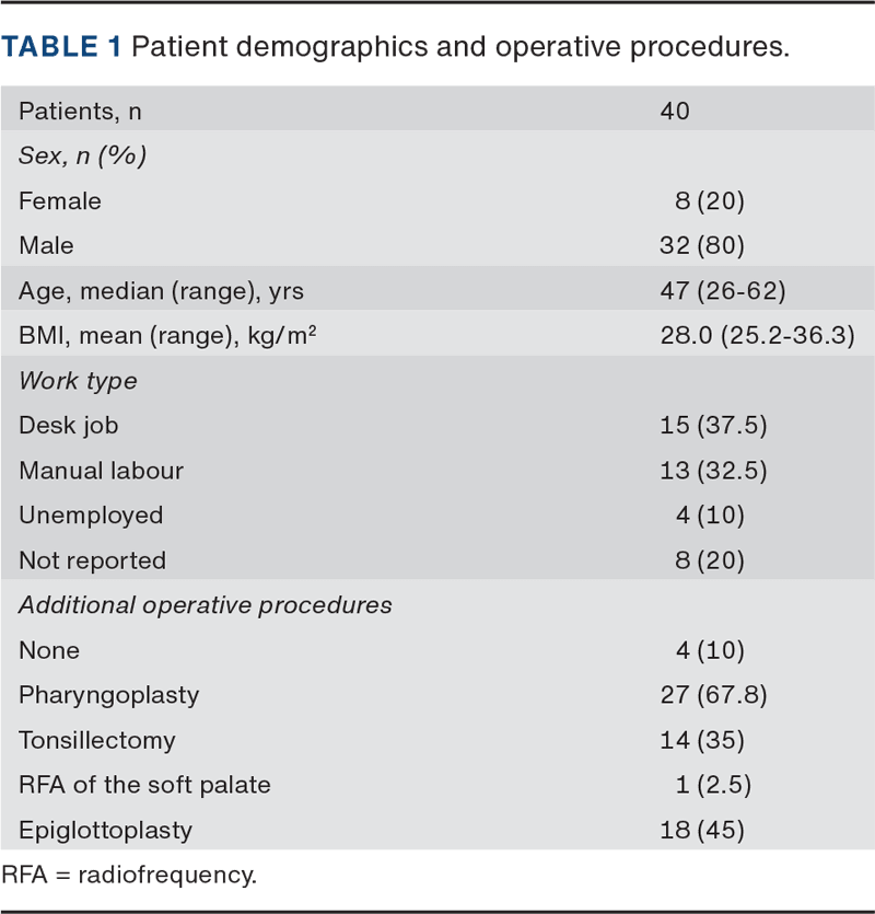 Forty patients underwent TORS-BOT;80% were male, with a median age of 47 years and a mean BMI of 28.6. Most were employed, with desk jobs being the most common occupation. Additional surgical procedures were frequently performed, particularly pharyngoplasty and epiglottoplasty, whereas only a small proportion underwent TORS-BOT alone (Table 1).