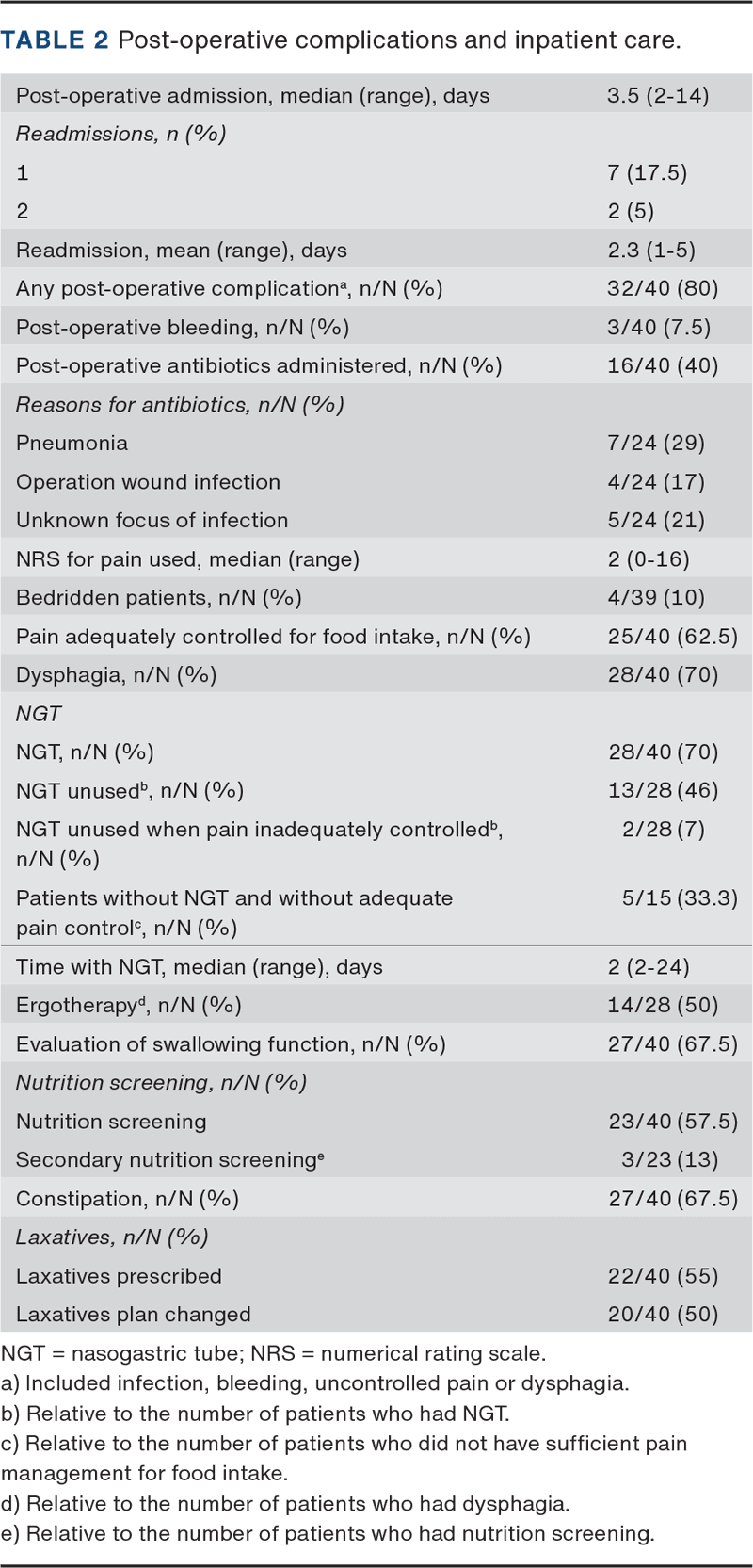 More than 80% of patients had either post-operative infection, bleeding, uncontrolled pain or dysphagia. Post-operative administration of antibiotics was common and used mainly for pneumonia. Pain management was insufficient for a considerable number of patients, though the frequency of pain assessments varied widely. Early dysphagia was common, resulting in a high rate of NGT use, often for several days. Swallowing assessments were performed in most cases, whereas ergotherapy was initiated only in about one-third of patients. A high incidence of post-operative constipation was observed among patients, potentially attributable to the routine administration of morphine. However, prophylactic laxative use was not universal (Table 2). Three patients (7.5%) required post-operative observation in the intensive care unit for airway swelling or bleeding. No patient underwent tracheotomy.