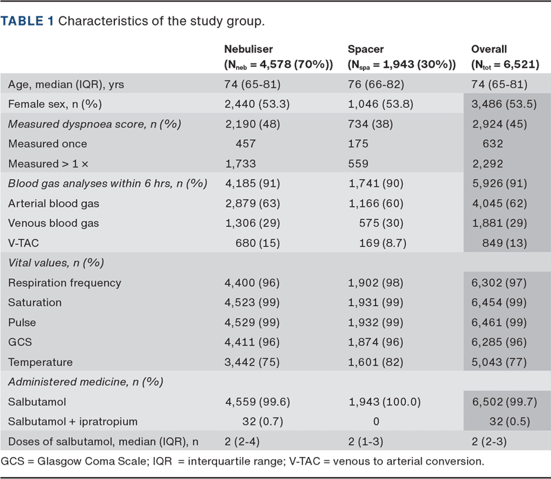 During the study period, β₂-agonists were administered at 6,788 patient encounters. A total of 267 patient encounters were excluded (227 were below 18 years of age, nine were of unknown age and 31 received β₂-agonist by both spacer and nebuliser) (Table 1).