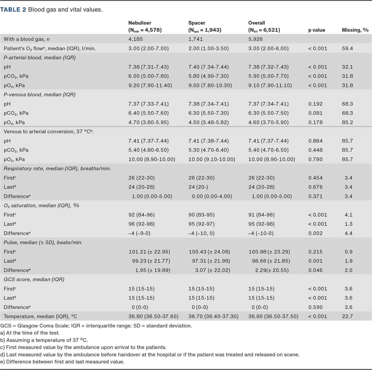 This quality assessment study showed that the patients who received β₂-agonist by spacer had similar relief of dyspnoea as patients who received the medicine by nebuliser. Similar conclusions on symptom relief have previously been documented [7, 15]. The spacer group had a more favourable arterial blood gas and a lower pulse rate than the nebuliser group, which indicated fewer side effects. These findings align with guidelines [2] and previous studies, which either found the two administration routes to be comparable or tended to prefer the spacer [2, 5, 7, 15, 16]. Previous research, however, was mostly conducted in primary care, emergency departments or during hospitalisation [8]. To our knowledge, this study is the first to compare the treatment effects of spacers and nebulisers in the prehospital setting.