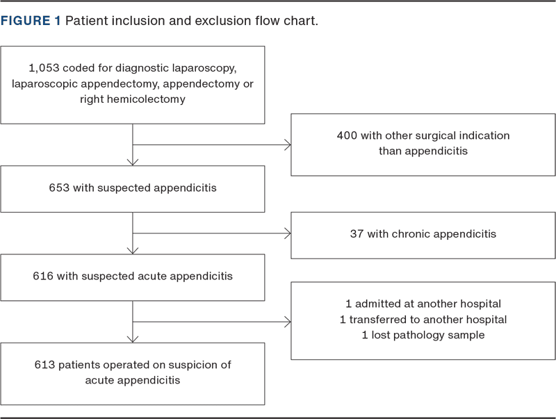Electronic records were screened for procedure codes corresponding to laparoscopic appendectomy, open appendectomy or diagnostic laparoscopy. Detailed review confirmed eligibility and allowed collection of demographics, clinical presentation, laboratory values, data necessary to calculate the Alvarado score (see Supplementary material - Appendix 1), imaging, intraoperative findings, histopathology and post-operative course. After exclusions (surgery performed on suspicion of non-AA diagnosis), 613 patients were included (Figure 1). Data were managed using Research Electronic Data Capture (REDCap) [10].