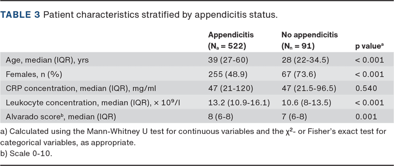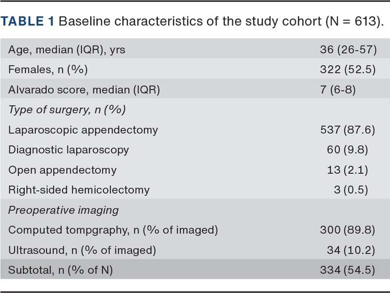 RESULTS. Among 613 patients, 522 had histologically confirmed appendicitis, yielding an overall negative appendectomy rate (NAR) of 14.9%. Patients without preoperative imaging (n = 279) had a NAR of 24.4%, compared with 6.9% among those who underwent preoperative imaging (n = 334).