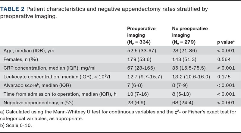 Patients undergoing preoperative imaging were older (median 52.5 (IQR: 33-67) versus 28 (IQR: 21-36) years; p < 0.001), had higher CRP levels (67 (IQR: 23-165) vs. 35 (IQR: 15.5-75.5) mg/l; p < 0.001) and lower Alvarado scores (7 (IQR: 6-8) vs. 8 (IQR: 7-9); p < 0.001) than patients who did not undergo imaging (Table 2).