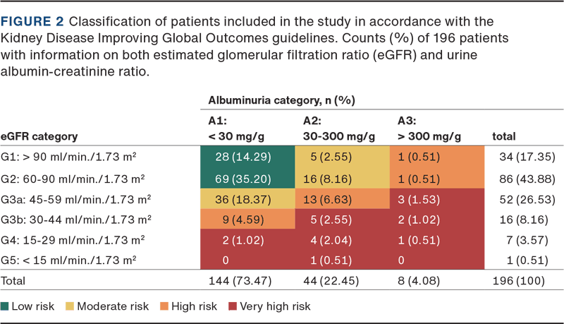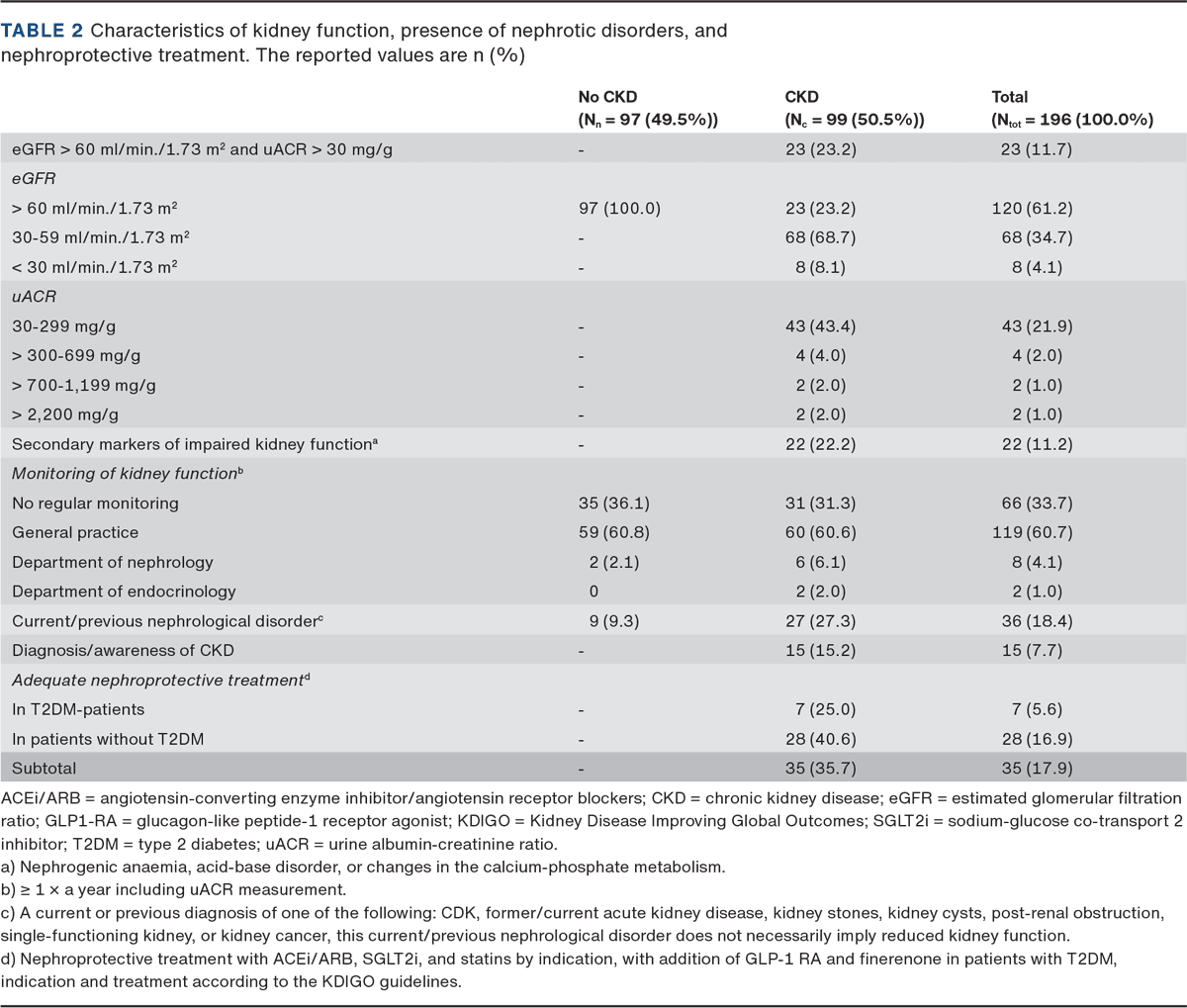 RESULTS. The prevalence of CKD was 50.5%, and 20.9% of patients were categorised with a high or very high CKD risk. In patients with CKD, 23.2% had albuminuria despite normal eGFR, 22.2% had secondary markers of kidney impairment, and only 15.2% were aware of having reduced kidney function. Regular kidney monitoring was lacking in 33.7% of patients, and 64.3% of patients with CKD did not receive the recommended treatment.