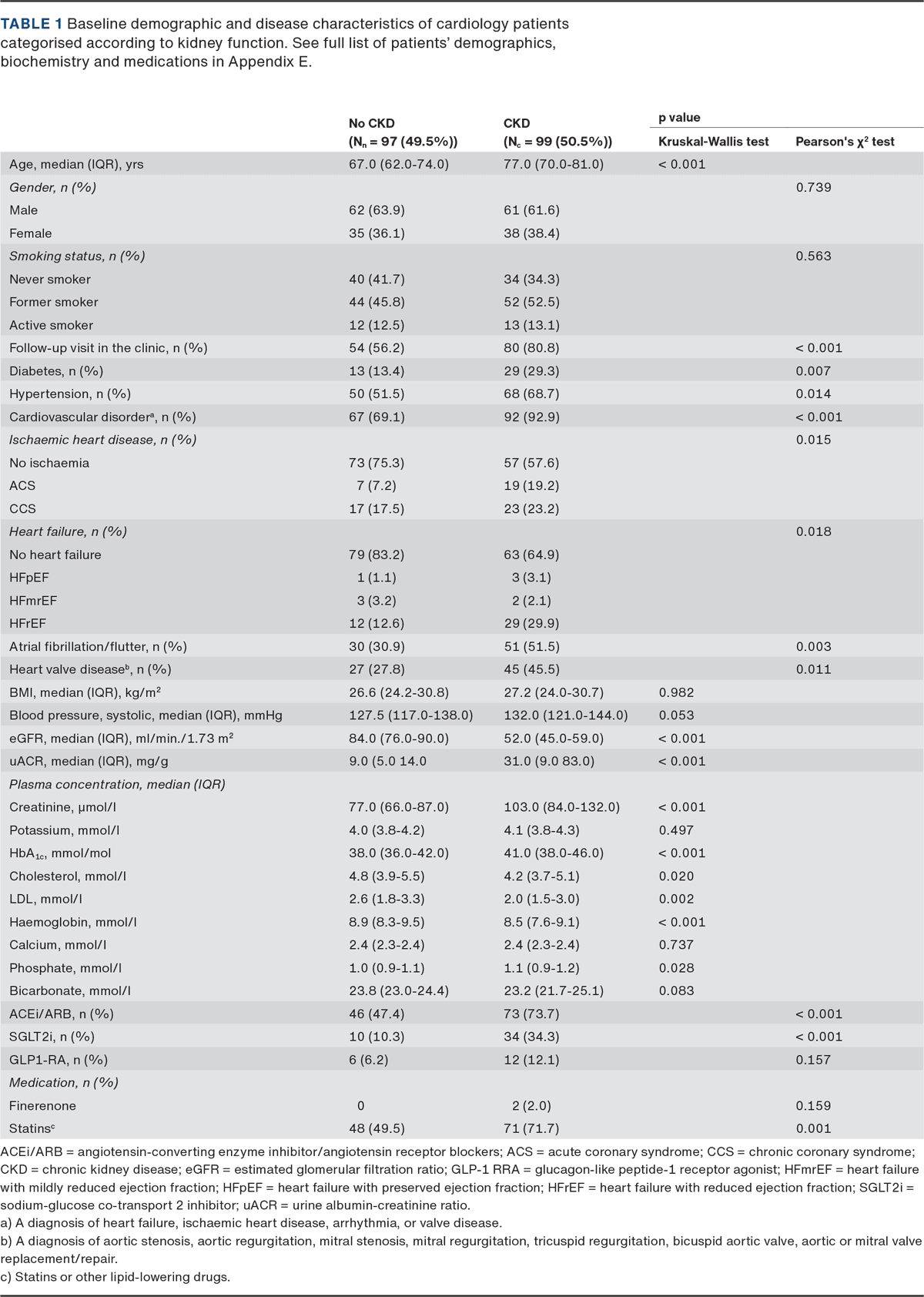 METHODS. This cross-sectional study included 196 patients from a cardiology outpatient clinic in Svendborg, Denmark. Blood and urine samples were analysed for the estimated glomerular filtration rate (eGFR), urine albumin-to-creatinine ratio and secondary markers of kidney impairment, in accordance with international guidelines. Medical history, risk factors and demographic information were obtained from a questionnaire. Regular CKD monitoring (≥ 1 ×/year) and nephroprotective drug use were evaluated.