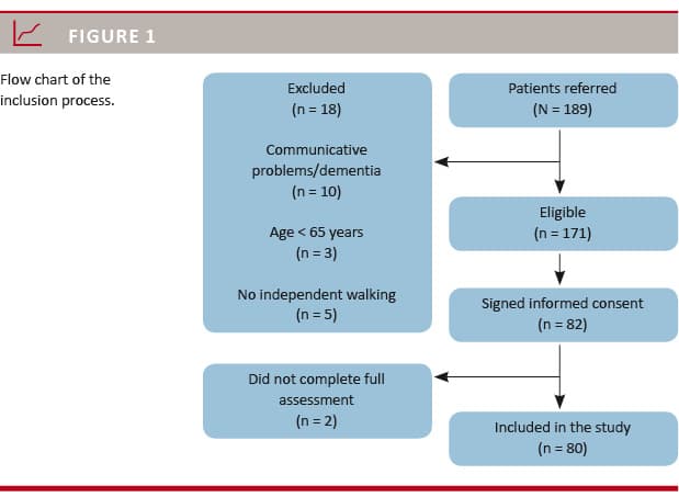 The study population consisted solely of patients recruited from a geriatric out-patient clinic (the Geriatric Section, Medical Department, Rigshospitalet – Glostrup) who were consecutively assessed for inclusion in the study from June 2014 through May 2015. Patients were referred to the geriatric out-patient clinic for fall assessment, geriatric assessment or follow-up after admission from wards at Rigshospitalet – Glostrup, other hospitals, or general practitioners. There was no recruitment from the emergency department. All patients provided their written, informed consent to participate in the extended assessment programme. The local ethical committee approved the study (H-3-2013-124).
