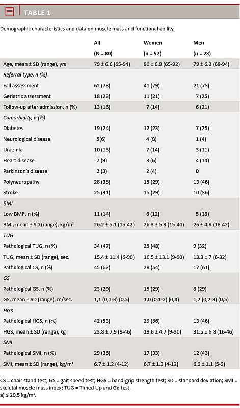 . The mean age in the study population was 79 years (65-94 years). Most of the participants were women (65%), and the majority of the patients were referred for fall assessment (78%). A low BMI was found in 20% of the patients > 80 years and in 9% among patients < 80 years.