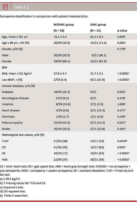 Low muscle strength as measured by hand-grip strength was found in 53% and according to the chair stand test in 62%. Low muscle function measured by gait speed and Timed Up and Go was present in 29% and 47% patients, respectively. A pathological muscle mass was found in 36% of the patients. The number of patients with a low muscle strength as measured by the chair stand test was 14 (67%) in the sarcopenia group and 31 (53%) in the group without sarcopenia; whereas measured by hand-grip strength, it was 20 (95 %) in the sarcopenia group versus 22 (37%) in the group without sarcopenia.