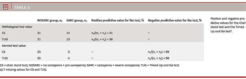 The negative predictive value was 89% for the chair stand test and 90% for Timed Up and Go, indicating that a patient with a normal test result has a very low probability of having sarcopenia (Table 3). The low positive predictive values for the chair stand test (31%) and the Timed Up and Go test (38%) indicate that these tests cannot be used as predictive assessment tools for sarcopenia (Table 3).