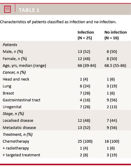 C-reactive protein (CRP) is produced in response to pro-inflammatory signalling and is therefore often elevated in the presence of a microbiological infection. However, it is not a specific marker, and it is also often elevated due to inflammatory reactions or cancer disease [1]. Furthermore, patients with solid tumours may be infected without showing signs of fever, either due to the use of prednisolone or non-steroidal anti-inflammatory drugs, or due to immunosuppression. Therefore, the usual signs of infection, such as fever, an elevated CRP and a high leukocyte count have only a limited use in patients with solid tumours.