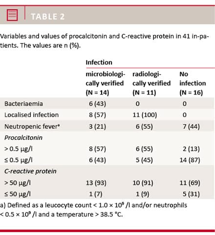 A total of 51 patients hospitalised due to fever or clinical signs of infection were included upon admission to the Department of Oncology. In all, ten patients never had PCT evaluated and were therefore excluded. Upon admission, the following data were obtained: a detailed history of the patients’ medical history, documentation of vital signs, physical examination and standard laboratory tests. Fever was defined as a temperature > 38.5 °C. In the presence of pulmonary symptoms or in the absence of a bacterial focus, a chest X-ray was performed at the discretion of the treating physician. Samples of blood and urine from all in-patients and, when relevant, material from other sites suspected of infection, were cultured before initiation of antibiotic treatment. Levels of CRP and PCT were measured on days one, two and three. Treatment decisions regarding the use of antibiotic treatment were made irrespective of the level of PCT and, if necessary, treatment was initiated before the PCT blood sample was taken. We independently reviewed the clinical, microbiological and radiological data of all in-patients in order to classify the patients into three groups: microbiologically verified infection, radiologically verified infection and no infection (the PCT and CRP values were blinded during this process). The following diagnostic criteria of infection were used: