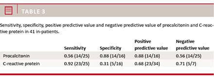 Sixteen in-patients were classified as having no infection. Despite being classified as having no infection, two of the 16 patients had a PCT > 0.5 microgram/l, corresponding to a positive predictive value of 0.88 (see Table 2 and Table 3).