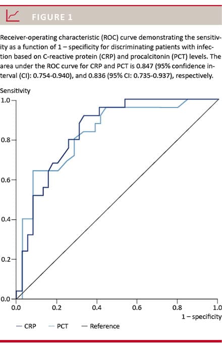 The area under the ROC curve was 0.836, (95% CI = 0.735-0.937) for PCT and 0.847 (95% CI = 0.754-0.940) for CRP (see Figure 1).
