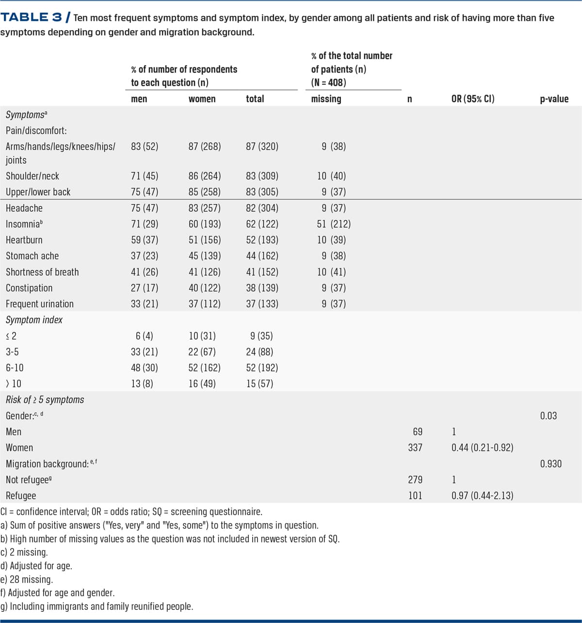 Table 3 shows the distribution of the ten most reported specific symptoms by gender along with a symptom index grouping the patients by number of symptoms reported. The predominant symptoms were pain-related, arising from the musculoskeletal system. The majority (62%) reported sleeping difficulties, more often men (71%) than women (60%). Gastrointestinal symptoms as well as less organ-specific somatic symptoms were common. The majority of patients (87%) reported ≥ 5 symptoms. Results from the logistic regression analysis showed a statistically significant protective effect of being a woman as compared with being a man on the risk of having more than five symptoms (odds ratio = 0.44; 95% confidene interval: 0.21-0.92), whereas no protective effect of being a refugee was identified.