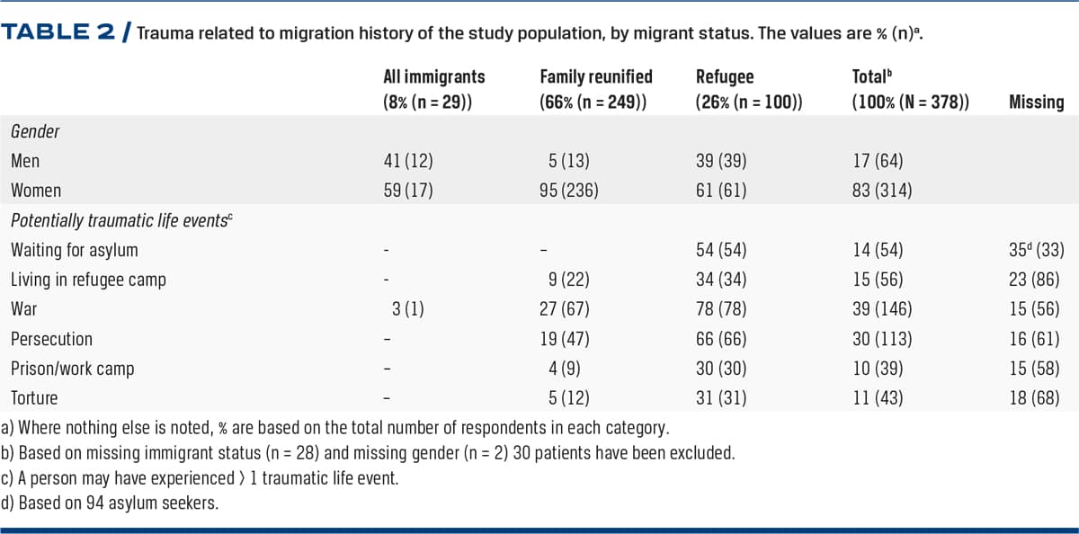 Table 1 shows sociodemographic characteristics of the study. Patients represented 43 different countries of birth, more than 20 different native languages/dialects and were primarily women (83%). A total of 19% of the patients had no basic schooling. Interpretation needs for both oral (74%) and written (72%) communication were reported more often by women than men, even though most patients had held their Danish residence permit for more than 20 years. Table 2 shows the trauma-related migration history of the study population by migrant status. A high percentage of family-reunified patients also reported having experienced war and persecution. The majority of patients were referred by general practitioners (86%).