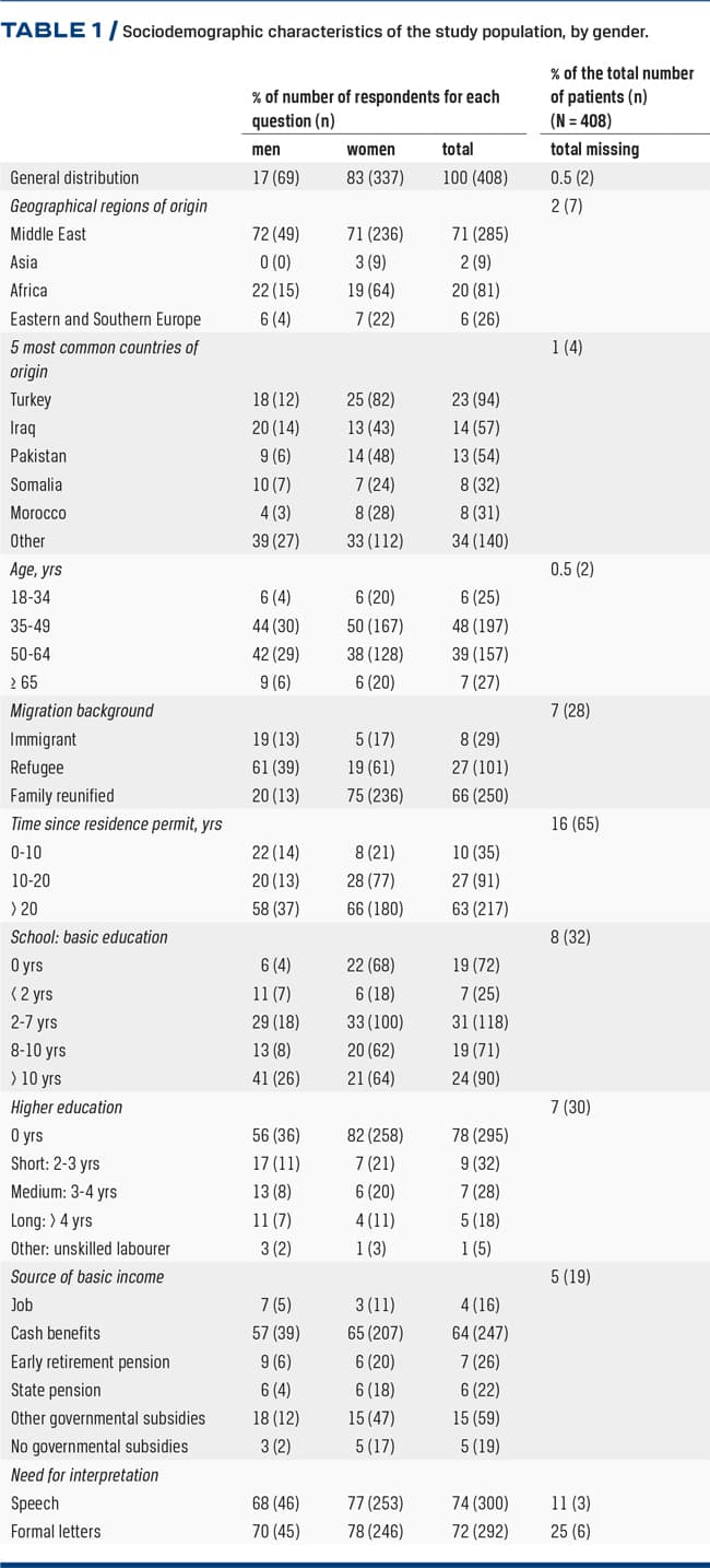 This cross-sectional survey included a population of 408 patients who attended the clinicfrom 1 January 2014 to 20 November 2017. The referral criteria for patients were as follows: i) ethnic minority background with ii) complex symptomatology, multi-morbidity or polypharmacy often in combination with psychosocial stressors, where iii) problems are too multifaceted for primary care or other services. Patents cannot be refereed if they present with i) isolated mental health problems, ii) isolated linguistic problems, iii) need for evaluation of work qualifications or iv) need of admission.