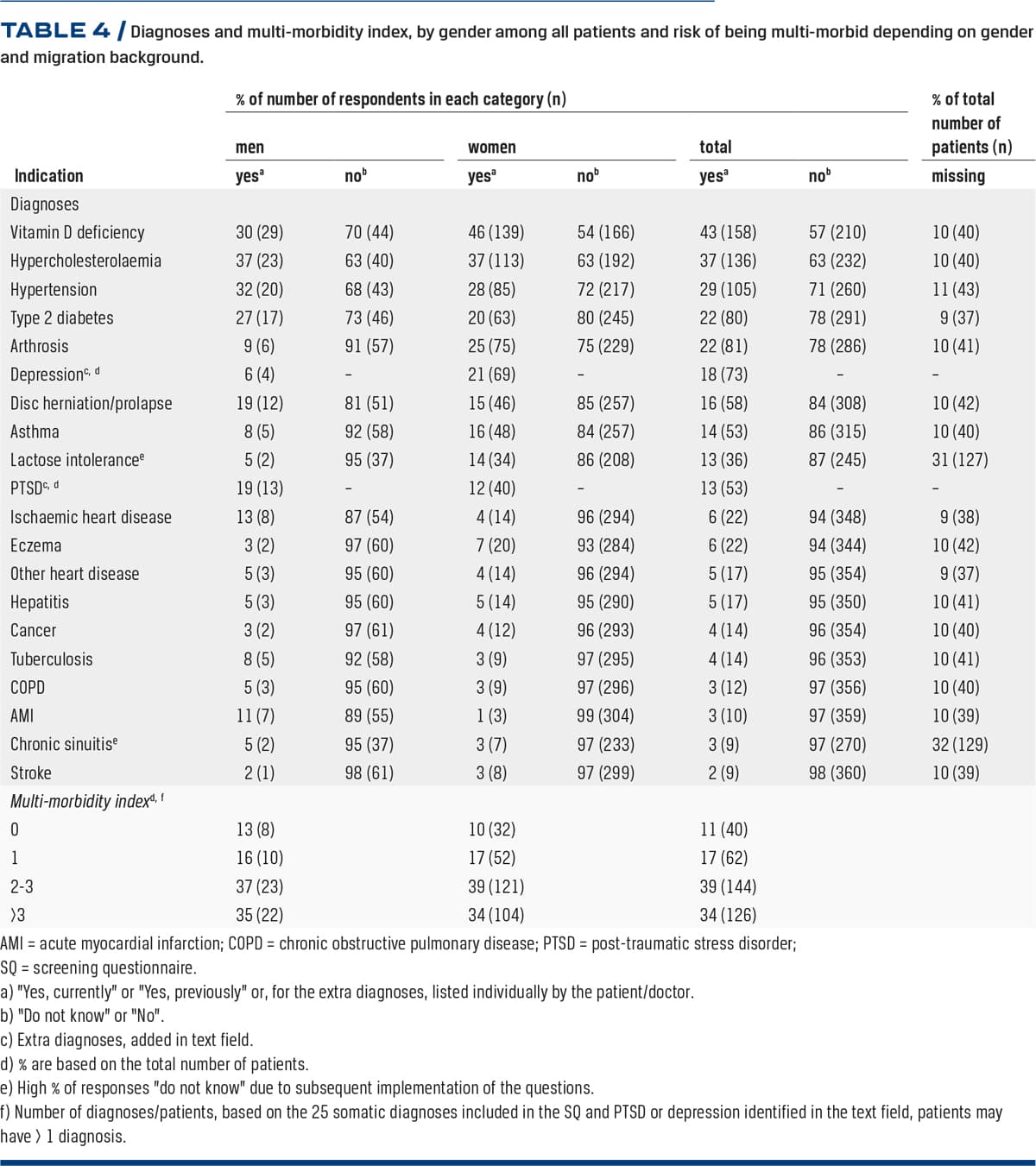 Second, symptom and morbidity patterns were shown to be complex with a high prevalence of musculoskeletal, pain-related complaints as well as relatively unspecific somatic symptoms such as stomach ache and dizziness – not unlike the symptom patterns seen in general practice [15]. Some of these symptoms may be explained by the high levels of vitamin-D deficiency, which are underpinned by another study on a similar migrant population [16].