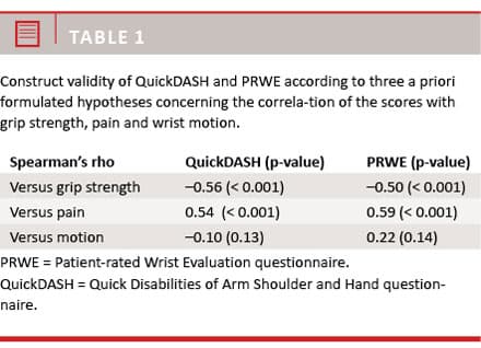 Material and methods: In a prospective cohort of 102 cases, we evaluated the QuickDASH. Furthermore, in a cross-sectional study and a test-retest on a subgroup of the patients, we evaluated the Patient-rated Wrist Evaluation.