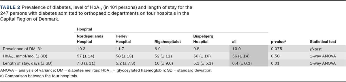 No Danish estimates exist of the prevalence of diabetes among hospitalised patients. In Non-Danish reports, the prevalence of hospitalised diabetes patients is approximately 20% [6, 7]. Moreover, only limited knowledge exists about the quality of in-hospital diabetes care in Denmark. In this study, we aimed to describe the prevalence of diabetes patients at four orthopaedic departments in the Capital Region of Denmark. We reported on hospital length of stay (LOS), diabetes management and other variables that we believe are important for the treatment of hospitalised patients with diabetes. The purpose was to provide an overview of diabetes-related conditions during hospitalisation, which may form the basis for future monitoring and improvements of the quality of diabetes management during hospitalisation.