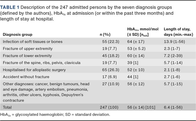 The diabetes treatment was reviewed and optimised by the diabetes specialist nurse teams during hospitalisation in 25 patients (10%). The mean hospitalisation time for these patients was 18 days and mean HbA1c was 66 mmol/mole (HbA1c was available for 12 patients). HbA1c was 55 mmol/mole (for 89 patients) in patients not seen by diabetes nurses (p = 0.007, t-test).