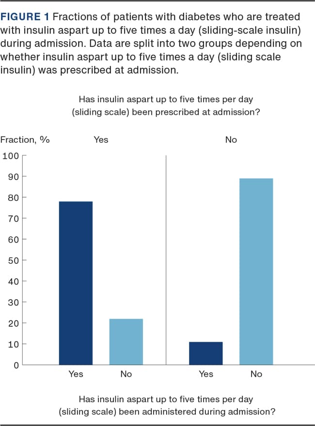 During hospitalisation, insulin aspart was prescribed up to five times a day (SSI) in 111 (45%) of the 247 patients with diabetes. Among these, 87 patients (78%) received insulin aspart at least once during hospitalisation as part of this prescription. Of the 135 patients who were not prescribed insulin aspart up to five times a day during their hospitalisation, 15 patients (11%) nevertheless received insulin aspart (see Figure 1). Among the 102 people who received insulin (whether prescribed at admission or not), 21 (20%) received insulin aspart 76-100% of the times when their blood glucose was so high that insulin was required. Sixteen patients (16%) received insulin 51-75% of the times it was required. Forty-five patients (45%) received insulin 26-50% of the required times and 20 (19%) patients were given insulin 0-25% of the times it should have been administered (see Figure 2).
