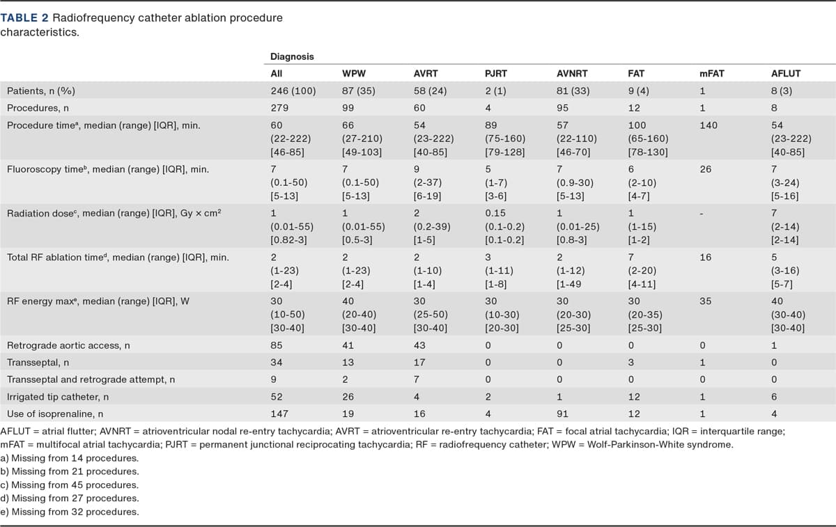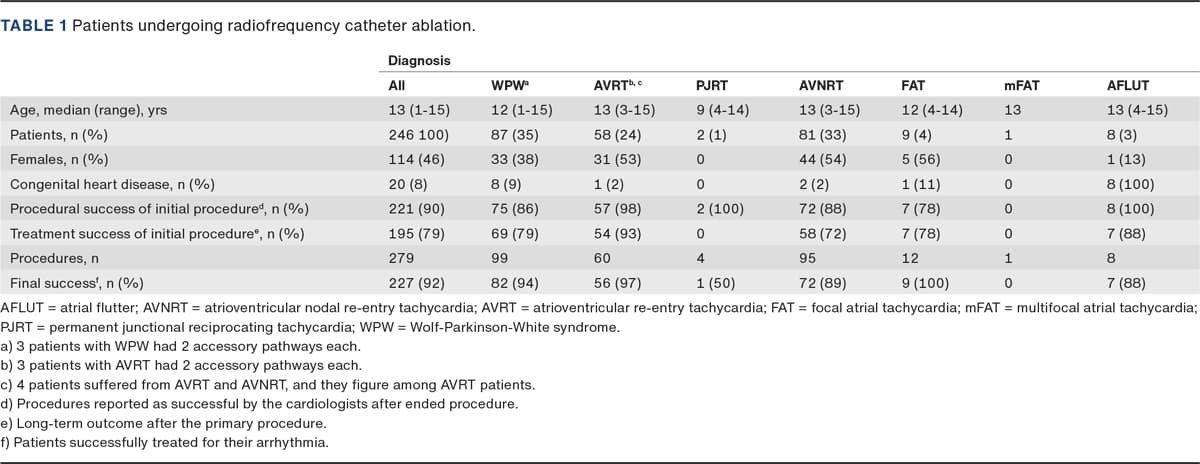 The aim of the present paper was to disclose the characteristics and outcomes of catheter ablation procedures in children and adolescents in a retrospective population-based study performed at a single specialised tertiary Scandinavian centre.