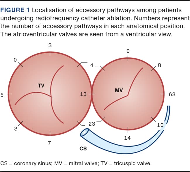 Arrhythmias were classified as Wolff-Parkinson-White syndrome (WPW), AV re-entry tachycardia (AVRT) in patients with exclusively ventriculo-atrial conducting accessory pathway, AV nodal re-entry tachycardia (AVNRT), permanent junctional reciprocating tachycardia, atrial flutter and multifocal or focal atrial tachycardia. For WPW, the presence of Mahaim fibres was noted. The location of accessory pathways was categorised in accordance with the consented nomenclature [4].