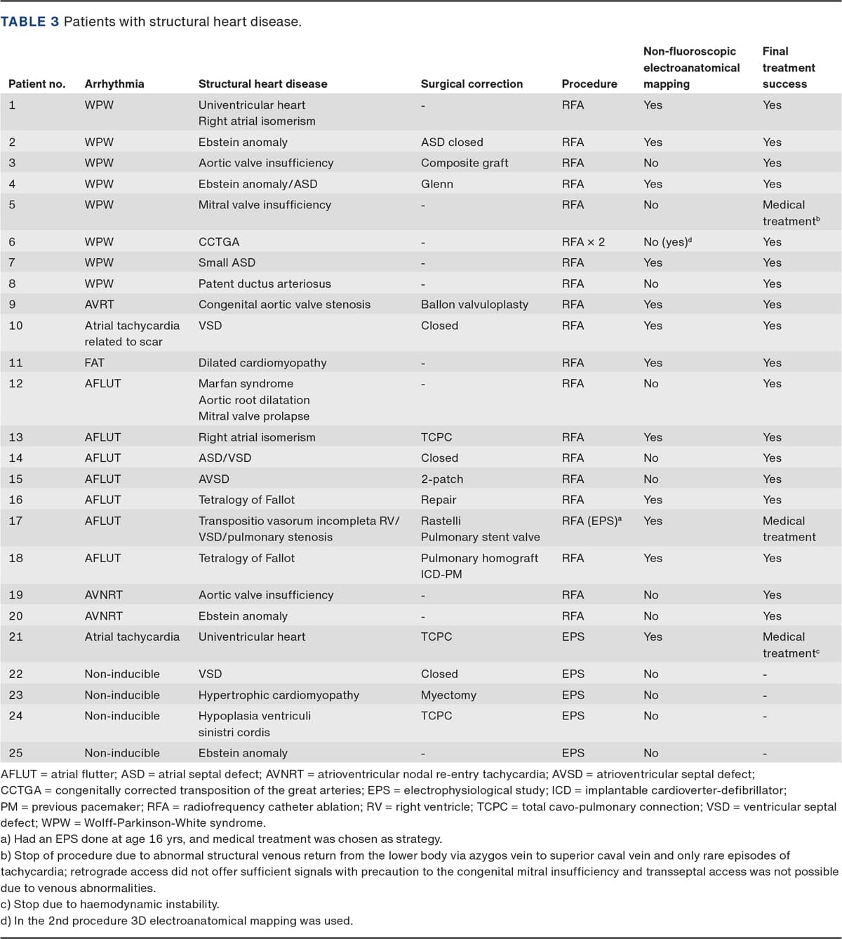 Structural heart disease was present in 25 patients of whom 20 were ablated (Table 3). Final treatment success was 90% (n = 18), which is not different from patients with structurally normal hearts (p = 0.69). Three-dimensional electro-anatomical mapping was used in 57% of the procedures compared with 20% in patients without structural heart disease.