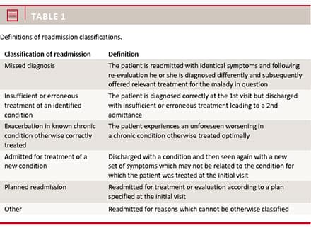 – Occurrence of readmission within 30 days of admission to ED. An estimate of the reason for readmission was classified according to the following five categories: missed diagnosis, insufficient or erroneous treatment of an identified condition, exacerbation in known chronic condition otherwise correctly treated, admit-