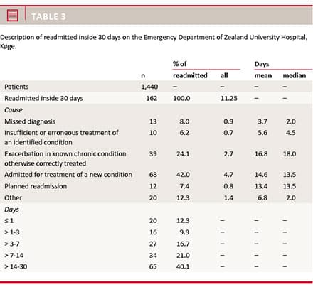 Some readmissions cannot be prevented. The data from the ED at Zealand University Hospital, Køge, show that 68 patients (42% of the readmissions) were readmitted for the assessment of a condition not related to the one that was primarily assessed. A total of 39 patients (24%) were readmitted due to a worsening of a chronic condition that was otherwise well treated. And, lastly, 12 patients (7%) had been scheduled for readmission. Hence, a total of 119 patients (73% of readmitted patients) were readmitted for unpreventable causes. The median number of days passing before readmittance for these causes ranged from 13 to 18 days.