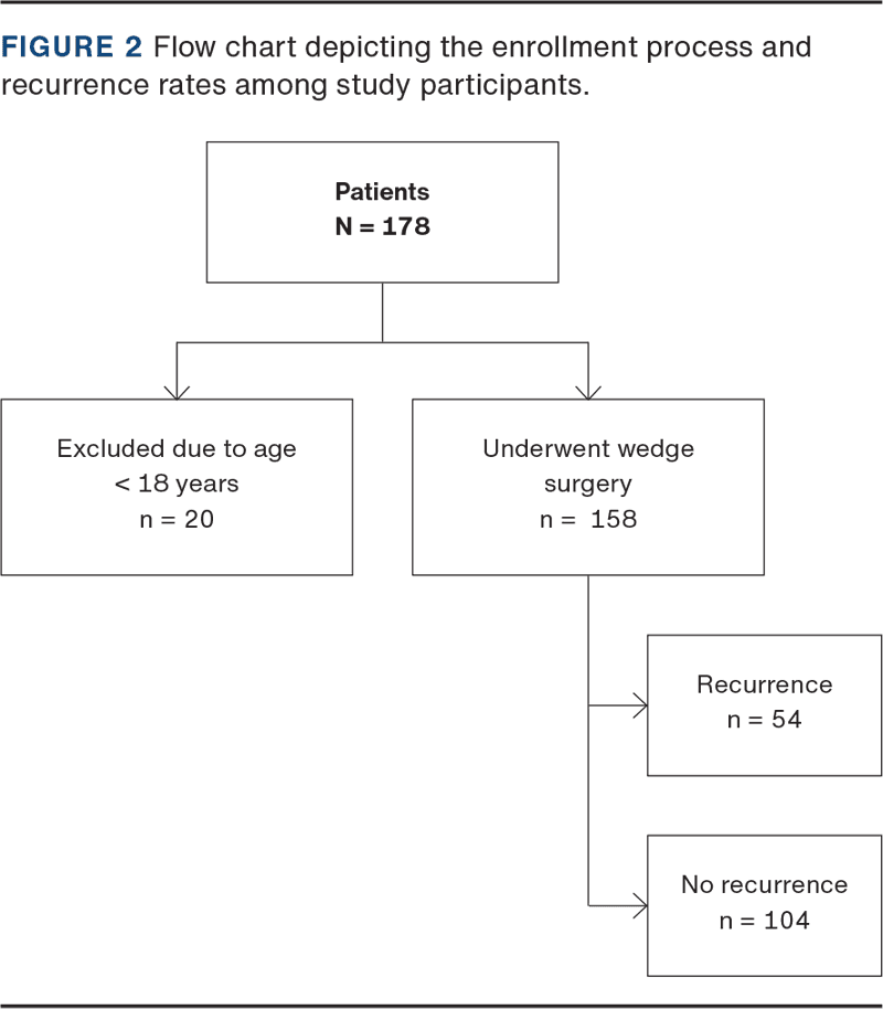 Between 2017 and 2022, 178 patients had a matrixectomy performed. Twenty patients were excluded because they were under 18 years of age, leaving 158 patients in the study (Figure 2).