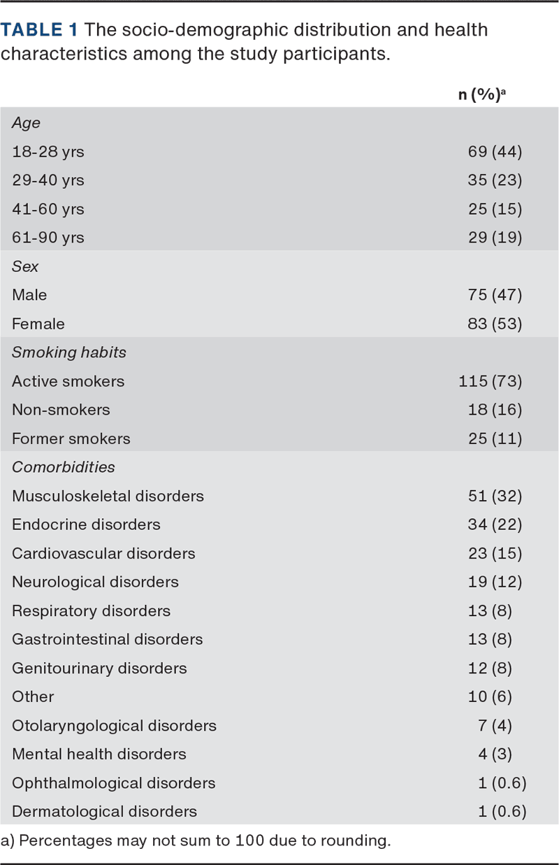 Among patients, 53% (n = 83) were females and 47% (n = 75) were males. The most prevalent age group was 18-28-year-olds, constituting 44% (n = 69). A total of 73% (n = 115) were active smokers, whereas musculoskeletal disorders (MSD) were the most prevalent comorbidity, affecting 32% (n = 51) of participants, followed by endocrine disorders at 22% (n = 34). Cardiovascular disorders were present in 15% (n = 23) of cases, whereas neurological disorders were reported in 12% (n = 19). Other less prevalent comorbidities included respiratory (8%, n = 13), gastrointestinal (8%, n = 13), genitourinary (8%, n = 12) and otolaryngological disorders (4%, n = 7). Furthermore, dermatological (0.6%, n = 1), ophthalmological (0.6%, n = 1) and mental health disorders (3%, n = 4) were observed (Table 1).