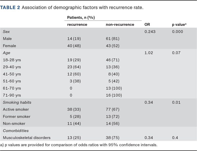 In this cohort, 54 patients exhibited recurrence, corresponding to an incidence of 34% (p < 0.05) (Figure 2). There was a tendency for the age group of 29-50-year-olds (OR = 1.02) to have slightly higher recurrence rates, though this association was not statistically significant (p = 0.07). A significant association was observed between recurrences and smoking (OR = 0.34, p = 0.016) and sex (OR = 0.24, p = 0.000), with lower odds of recurrence in smokers and males (Table 2).