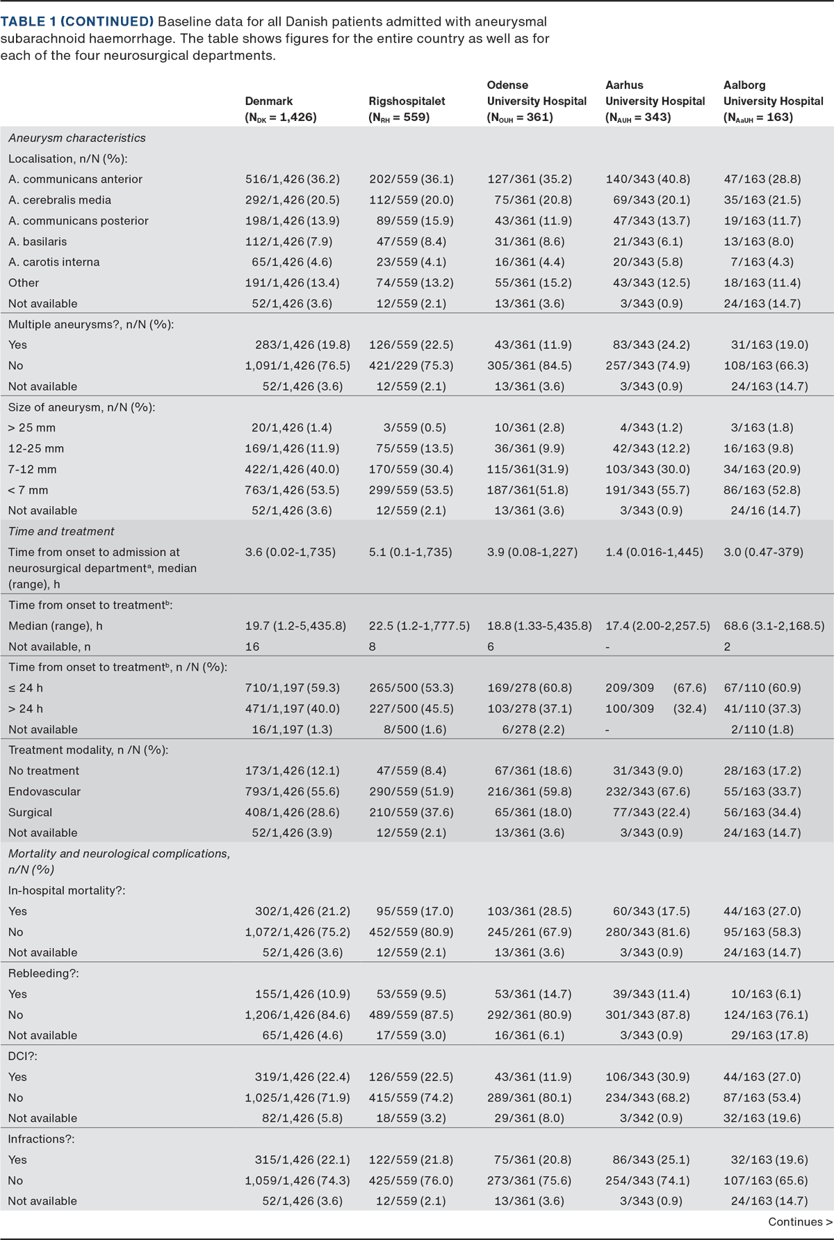 A total of 1,426 patients were registered with aSAH in DanStroke during the study period, of whom 39.2% were admitted to RH, 25.3% to OUH, 24.0% to AUH and 11.4% to AaUH.