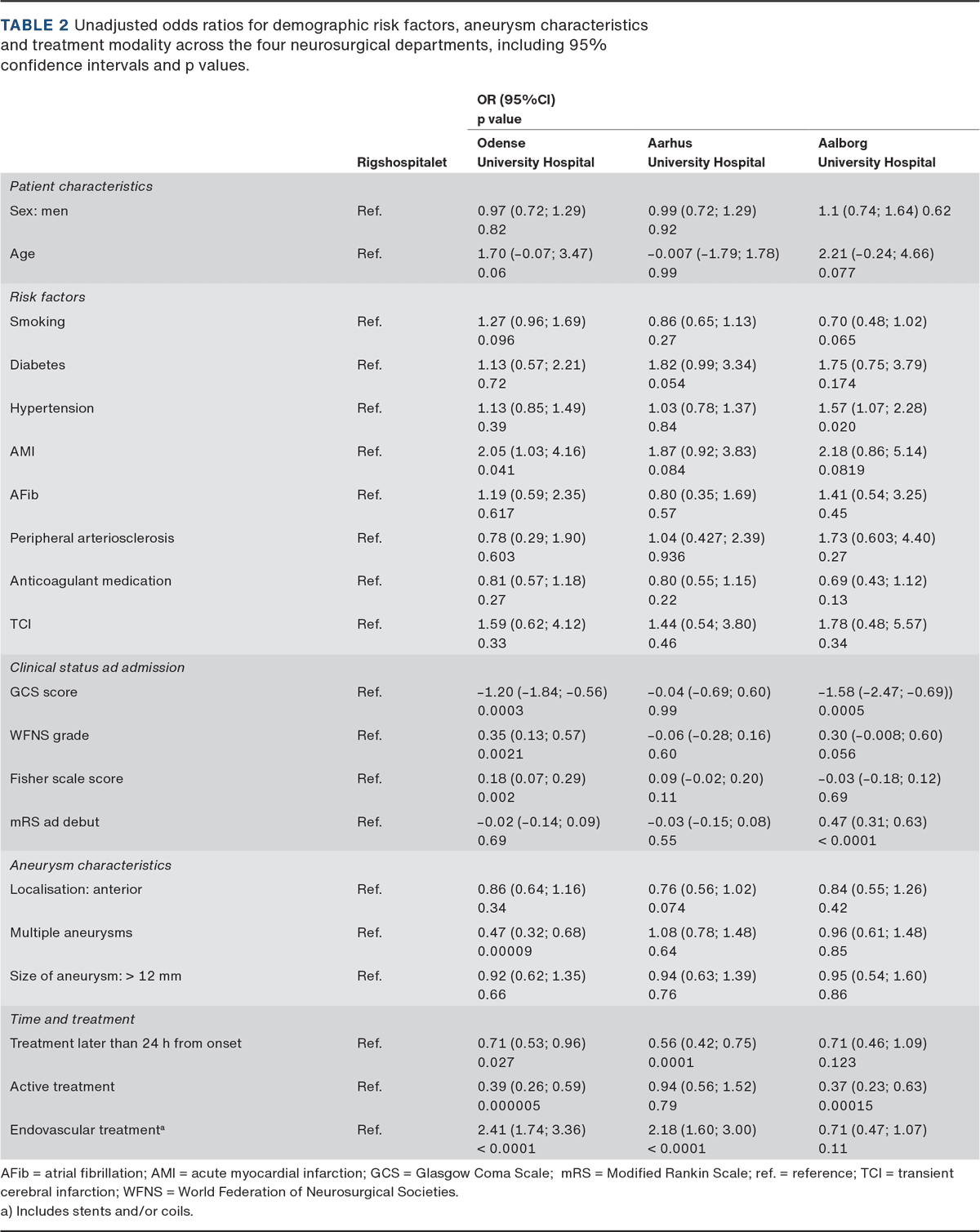 Differences in risk factors, mortality and neurological complications between the four neurosurgical departments were analysed using logistic regression models, with results presented as OR with 95% CI. Adjusted and unadjusted analyses were performed on variables related to neurological complications and vital status. In the adjusted analyses, adjustments were made for age and the GCS at admission, as these parameters influence patient outcomes after aSAH. Since RH receives and treats the most patients, it was chosen as the reference for all analyses. p < 0.05 was considered statistically significant.