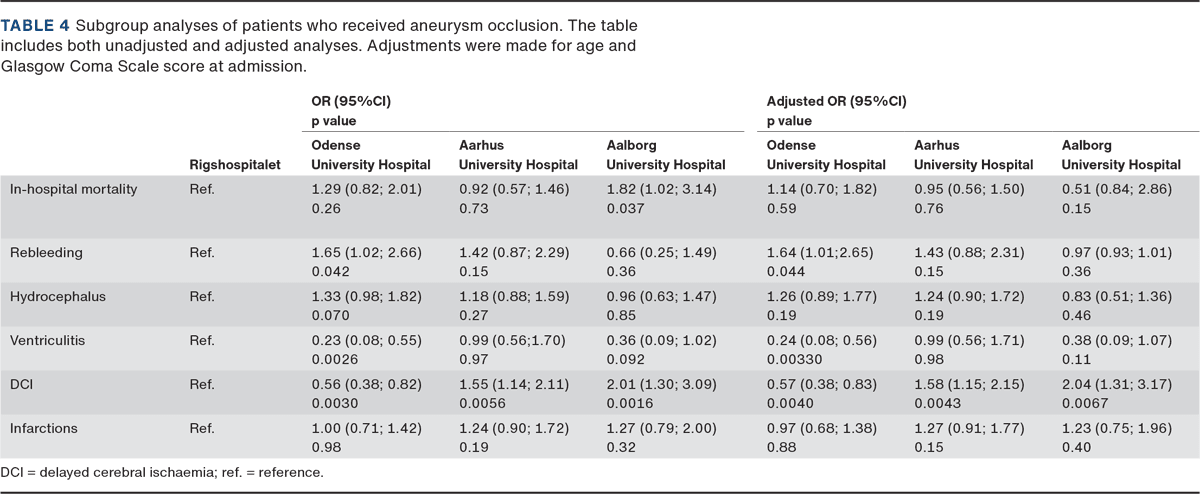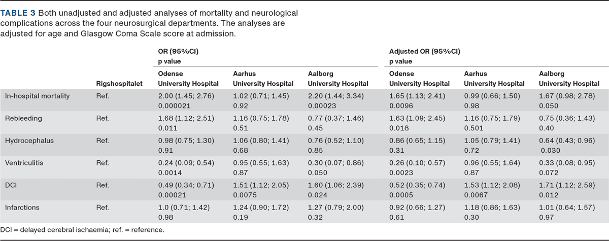 Table 3 presents differences in neurological complications and mortality among the four neurosurgical departments in Denmark. After adjusting for age and GCS, there was a significantly higher risk of in-hospital mortality among patients at OUH than at RH.