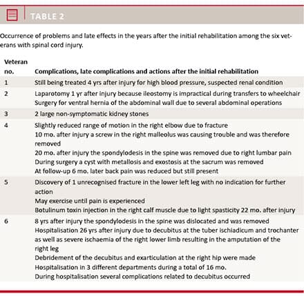 Four veterans from Iraq and Afghanistan suffered polytrauma due to explosions, including traumatic brain injury, vertebral and extremity fractures, musculoskeletal injuries, gastrointestinal, kidney and liver injuries, ulcer problems, etc., and one had methicillin-resistant Staphylococcus aureus (MRSA). The above injuries complicated the rehabilitation and resulted in re-hospitalisation and treatment in specialised units. They all had thoracic lesions and one had lumbar spinal cord lesions; four of the lesions were complete. The total length of hospitalisation was 5.5 to 12 months (Table 1). All veterans consulted psychologists during hospitalisation and two were advised to attend further consultations with military psychologists after discharge, but PTSD or other mental disorders were not described in the medical records. Furthermore, all veterans were offered counselling concerning sexuality, and five accepted this offer. At discharge from the initial rehabilitation, all six veterans took some sort of medicine; four received medicine for their bowel function, three were on analgesics, and two received medicine for long-term treatment of urinary tract infection. In addition, some had to take medication for spasticity, anticoagulation, antibiotics due to ostitis and sleeping pills. They were all offered the usual follow-up examinations every second year after discharge. In the years after discharge, all six veterans experienced physical complications related to their injuries (Table 2).