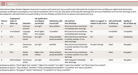 At follow-up by telephone interview, the veterans answered 33 selected questions from the project International Labour Market Integration Assessment in persons with Spinal Cord Injury (ILIAS), which contains a