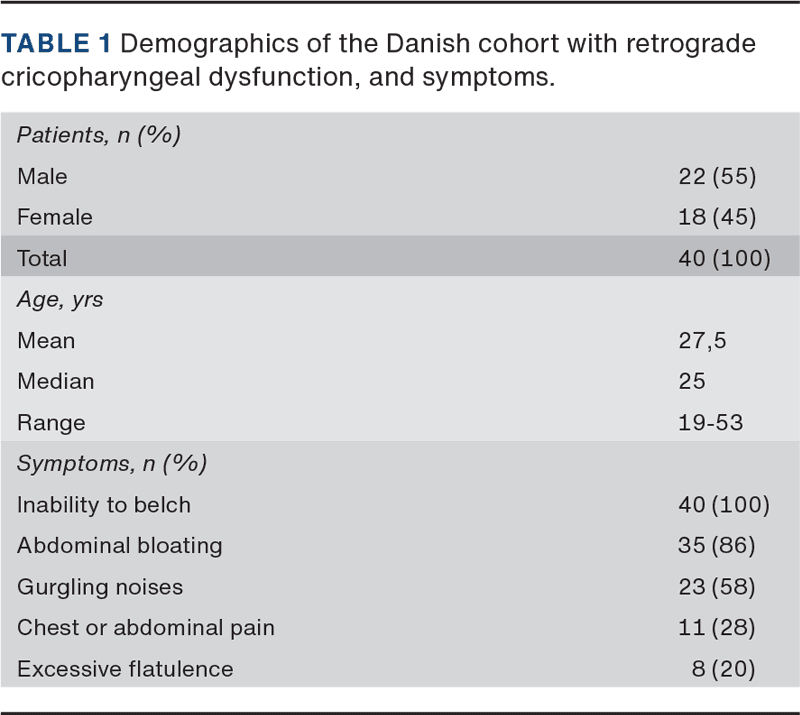 This study is the first analysis of a Danish R-CPD cohort, with patients referred to the Department of Otorhinolaryngology, Head, and Neck Surgery, Aarhus University Hospital, from all regions of Denmark. The primary symptom among patients was the inability to belch, and many had undergone prior evaluations by general practitioners, gastroenterologists or abdominal surgeons, often without a definitive diagnosis. Some patients had received a diagnosis of irritable bowel syndrome (IBS), whereas others had been treated with anti-reflux medication without symptom relief.