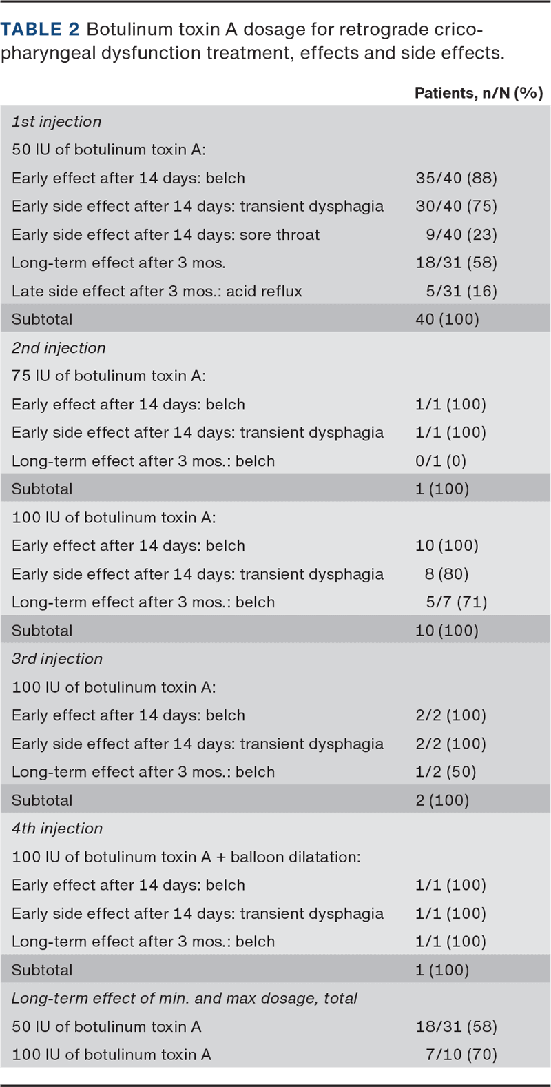The standard initial botulinum toxin A dose was 50 IU for all patients; and in case of treatment failure, patients were offered a second injection of 75 or 100 IU. A few patients with unsatisfactory results received a third and fourth injection, and one procedure included proximal oesophageal balloon dilation. Response to treatment was defined as the ability to belch within 14 days (early effect) and after three months (long-term effect). Details regarding botulinum toxin A treatment, outcomes and adverse effects are summarised in Table 2. No patients reported respiratory difficulties or voice changes following the procedure.