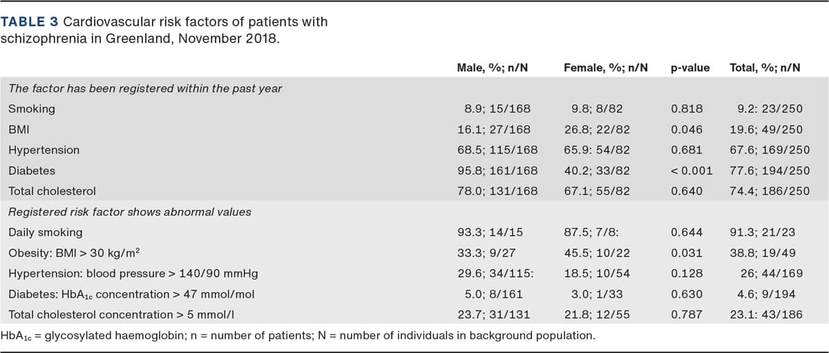 Metabolic and cardiovascular risk factors were available for 9-77% of the patients indicating that there is room for improved cardiovascular preventive care. The proportion of patients who were smokers was very high, 91%, compared to 52% in the general population [15]. Also, the proportion with obesity, 45.5% of the women and 33.3% of the men, was higher than the percentages in the general population, 32% and 24%, respectively [15]. The prevalence of diabetes, 4.6%, was also slightly higher than the reported prevalence among adults in Greenland, 2.5% [18, 19]. The suboptimal monitoring of cardiovascular risk factors documented in this study is in line with a global trend. Patients with severe mental illness are less likely to be tested for metabolic risk factors than the general population. Somatic health problems are therefore widely underdiagnosed and undertreated among people with severe mental illness [19].