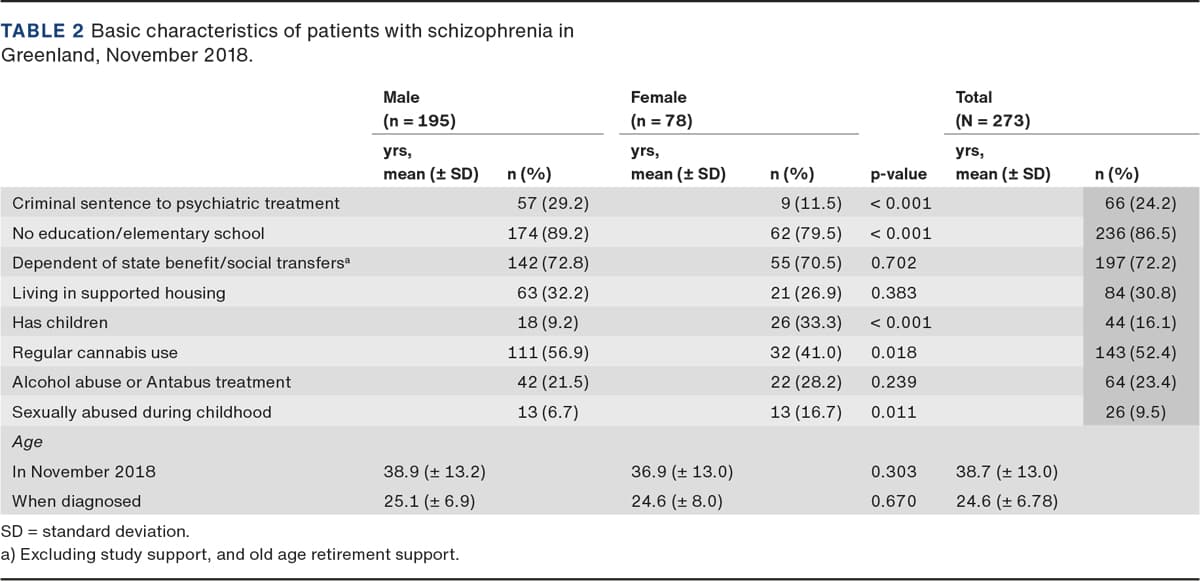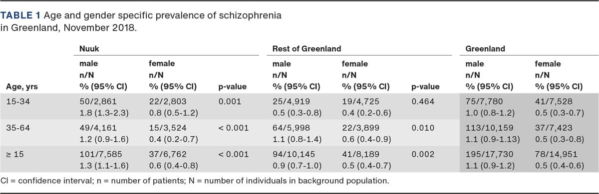 Schizophrenia is a mental disorder characterised by distortions in thinking, perceptions of the self and the surroundings, emotions and behaviour. It is among the costliest mental disorders in terms of human suffering and social expenditure, and it causes approximately 1% of the worldwide disability-adjusted life years [1]. Thus, schizophrenia is associated with psychosocial problems, including unemployment, homelessness, substance abuse and having poor social relationships [2]. Furthermore, a high prevalence of obesity, dyslipidaemia, diabetes, hypertension, tobacco smoking and metabolic adverse effects of antipsychotics is frequent among these patients. Life expectancy is 15-20 years lower among patients with schizophrenia than among the background population [3]. Globally, the prevalence of schizophrenia varies between 0.5 and 0.9% [4, 5]. A study published in 1995 based on first hospitalisation indicated that the incidence of schizophrenia was comparable in Greenland and Denmark [6]. Several studies performed in Greenland have indicated a high prevalence of psychosocial problems including suicide, anxiety and depression among primary healthcare patients [7, 8]. However, the actual prevalence of schizophrenia in Greenland remains unexplored. The aim of this study was to determine the prevalence of schizophrenia in Greenland and in the capital Nuuk, and to describe demographic data and socioeconomic and physical health factors among the patients.