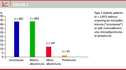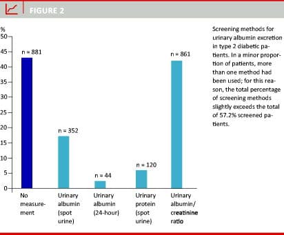 In conclusion, screening for microalbuminuria in type 2 diabetes in Danish primary care is insufficiently implemented, whereas renal function is evaluated in almost all patients by plasma-creatinine measurements. More information on optimal urinary screening methods and the importance of diagnosing microalbuminuria and albuminuria seems to be needed.