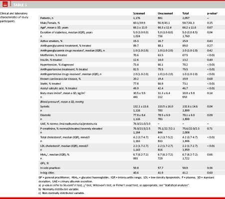 The primary end-points were the proportion of patients screened for microalbuminuria within the preceding 12 months and the level of urinary albumin excretion among these patients. The patients’ standard clinical and laboratory characteristics were recorded, including age, sex, duration of diabetes, history of CVD and hypertension, smoking, weight, body mass index, blood pressure, pharmacological treatment (glucose-lowering drugs, antihypertensive treatment, anticoagulant medication, lipid-lowering medication), and the following biochemical variables: glycated haemoglobin (HbA1c), plasma-creatinine, total and low-density lipoprotein cholesterol.