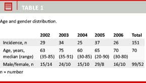 A total of 151 patients were admitted for definite (N=128) or suspected (N=23) IE at our hospital. Two patients had recurrent endocarditis. The patients’ age and sex distribution is shown in Table 1. The median age was 70 years.