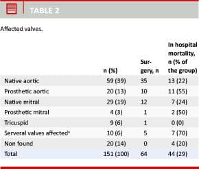 Material and methods: This is a retrospective study based on medical records from patients in whom the discharge diagnosis infective endocarditis was established according to Duke’s criteria. The study included 151 patients.
