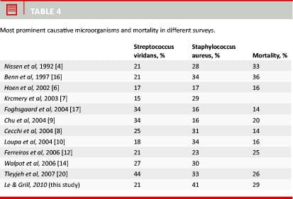 Krcmery V, Gogová M, Ondrusová A et al. Slovak Endocarditis Study Group. Etiology and risk factors of 339 cases of infective endocarditis: report from a 10-year national prospective survey in the Slovak Republic. J Chemother 2003;15:579-83.