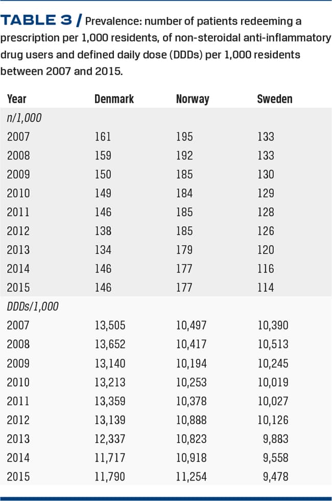 The prevalence of NSAID users decreased during the study period in all three countries. Norway had the highest prevalence, followed by Denmark and Sweden. Between 2007 and 2015, the average DDD per 1,000 residents decreased in Denmark and Sweden, whereas it increased in Norway (Table 3).