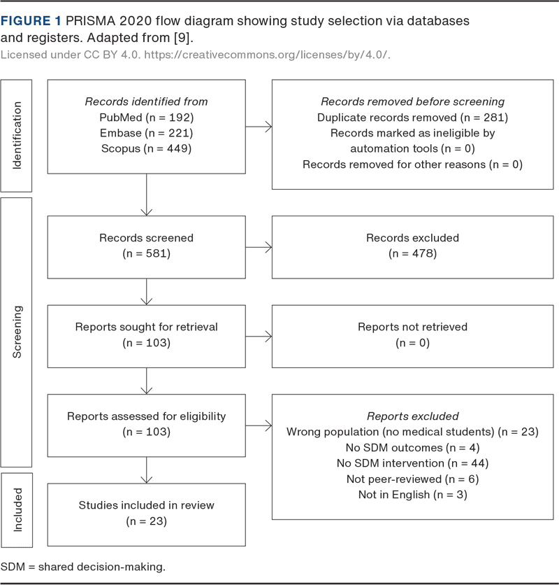 Studies were eligible if they described an educational intervention involving SDM, included medical students as the primary study population, and reported outcomes related to SDM competencies. For mixed-learner groups, only studies that reported outcomes separately for medical students were included.
